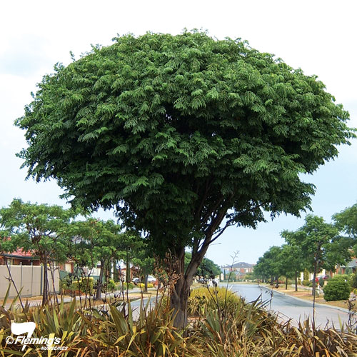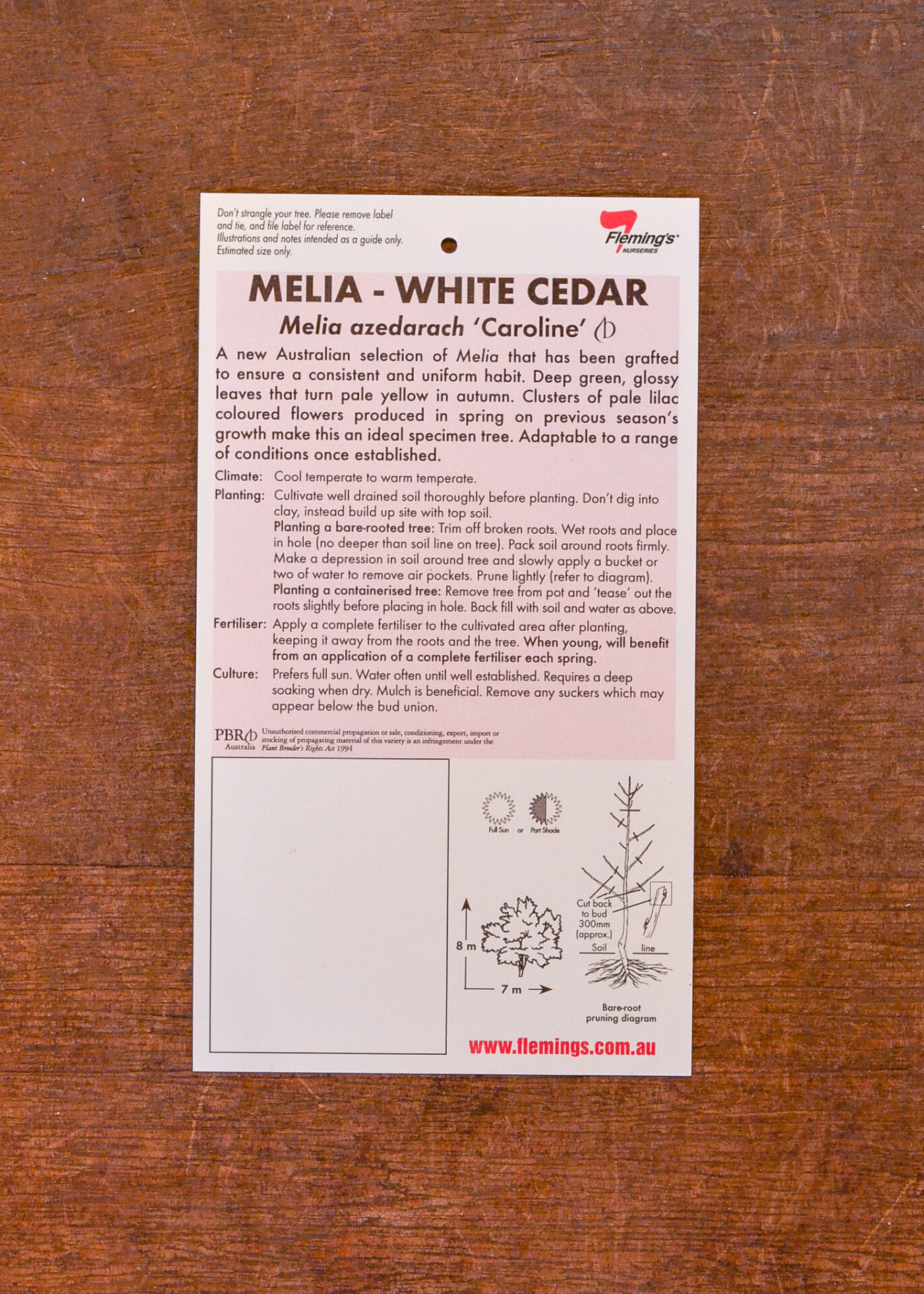 A new Australian selection of Melia that has been grafted to ensure a consistent and uniform habit. A hardy flowering tree chosen for its drought tolerance, soft foliage and showy flowers. Tolerates most soil types. Full sun to part shade. Sometimes referred to as a “Cape Lilac” or “White Cedar”.